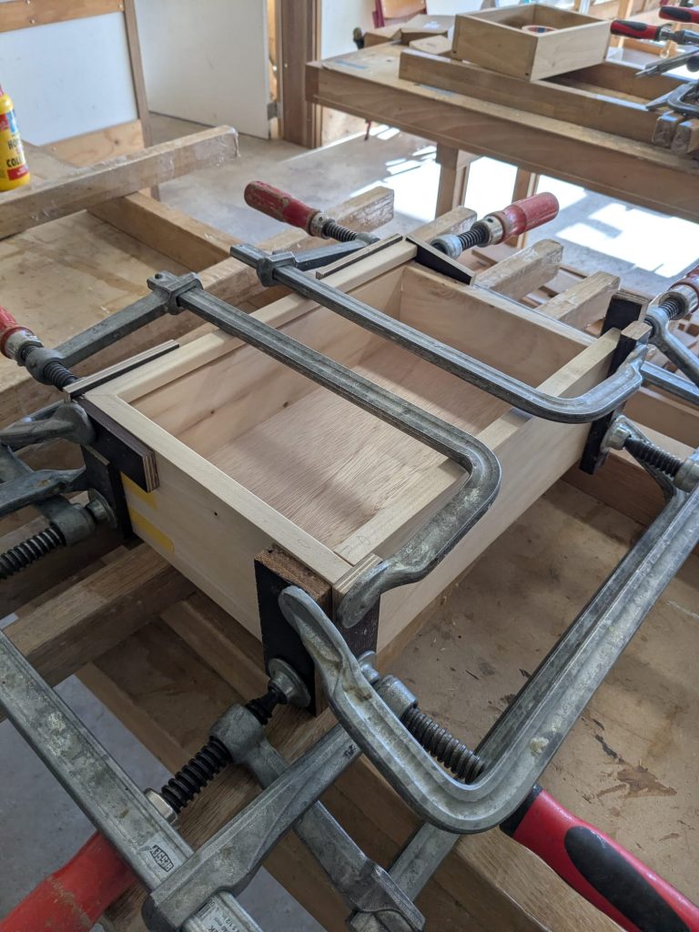 This stage requires preparation: making sure everything fits beforehand, organizing clamps, and working efficiently before the glue starts to set. Even with careful preparation, it’s always a bit of a puzzle to get every corner aligned and under the right pressure.