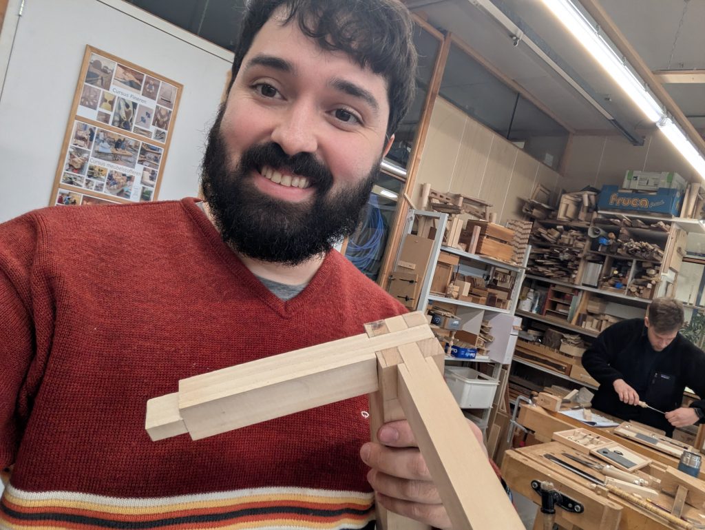 I started by carefully drawing out the joint, taking my time to think through each line and measurement. Once everything was marked, I began sawing with a Japanese handsaw, focusing on accuracy and staying true the sensei’s words: “lines are holy”. After fitting the main sections together and making sure everything sat snugly, I moved on to cutting the internal interlocking mechanism.